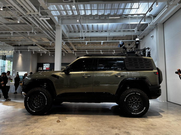 猛士M817的车身侧面姿态延续了猛士家族化设计,大尺寸轮包如同贲张的肌肉,适配35英寸大脚胎,整体看去力量感十足;后视镜采用极窄边框设计,降低风阻的同时提升视野范围。