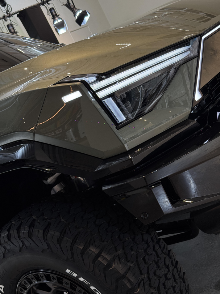 细节处,车头两侧的大灯还原了古代兵器“戈”的造型,日行灯花纹来源于天下第一剑“越王勾践剑”,硬核框架下又添别样韵味。分体式越野保险杠直接与副车架结合,在传承军车力量感的同时,更加安全可靠。